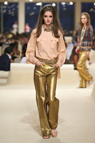 Особенное впечатление на публику произвели золотые брюки моделей.