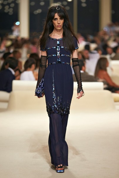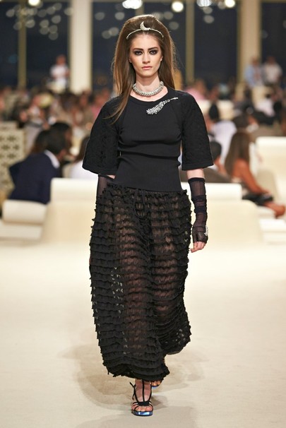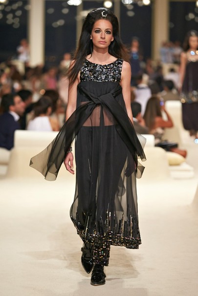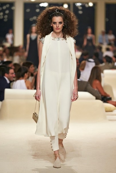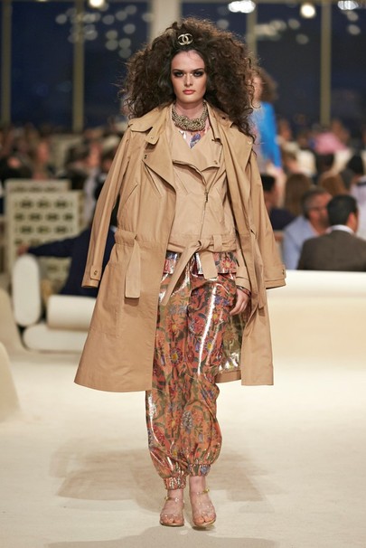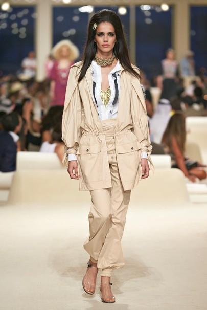 Макияж моделей , представленный на импровизированном подиуме на берегу моря, слишком сильный, вычурный. Сильно выделены глаза моделей. Море туши, подводки и черного карандаша , а также подчеркивание бровей – вот что предлагает кутюрье Карл Лагерфельд в предстоящем сезоне.