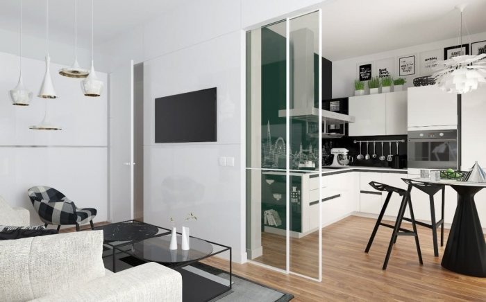 Фото: Стеклянные перегородки для зонирования кухни и гостиной