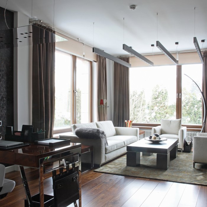 Когда мы входим в кабинет загородного дома, нас окружает атмосфера спокойствия и комфорта. Интерьер этого помещения создан с учетом всех деталей, чтобы обеспечить максимальное удобство и функциональность для работы и отдыха. Изящная и элегантная мебель, выполненная из натуральных материалов, придают кабинету особый шарм и стиль. Просторный письменный стол с удобным креслом позволяет работать с максимальным комфортом и эффективностью. На полках и стеллажах размещены книги, редкие артефакты и коллекции, которые добавляют интеллектуальную изысканность и интерес к обстановке. Мягкий ковровый покрытие на полу не только создает ощущение тепла и уюта, но и поглощает звуки, что способствует концентрации и позволяет работать в тихом и спокойном окружении. Все это вместе создает идеальное место для работы, чтения или просто проведения времени в уединении. Открытые окна и яркий свет проникают в комнату, придавая ей свежесть и жизненную энергию. Кабинет в загородном доме - это настоящий уголок роскоши и удовольствия, где можно погрузиться в работу и одновременно наслаждаться окружающей обстановкой.