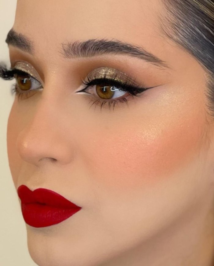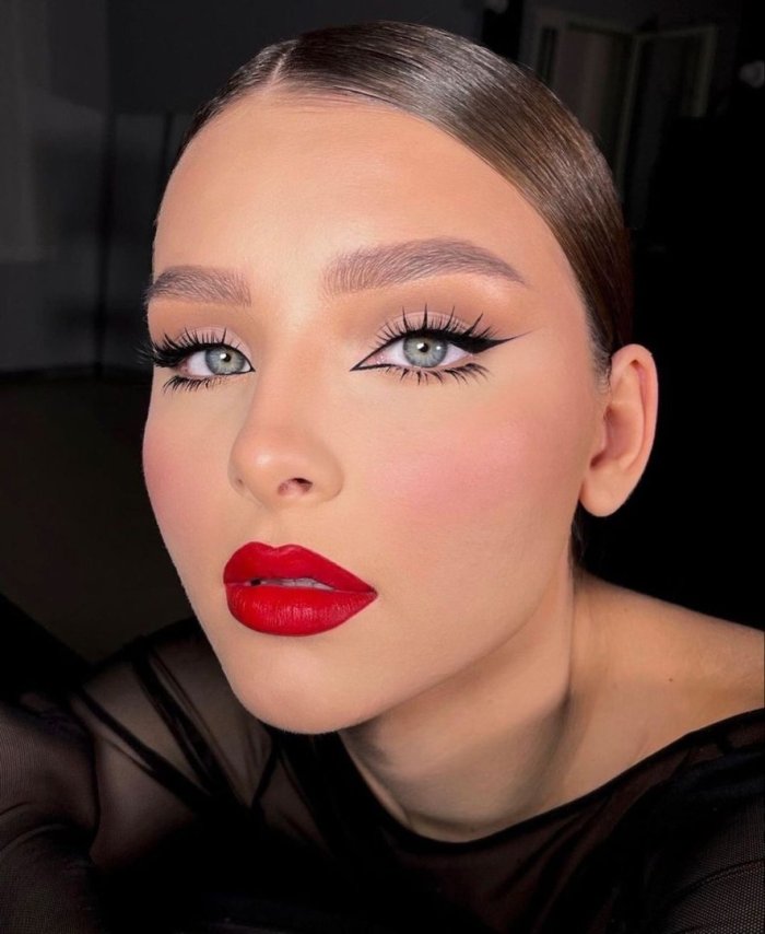 Макияж для карих глаз с красной помадой на Новый год 2025