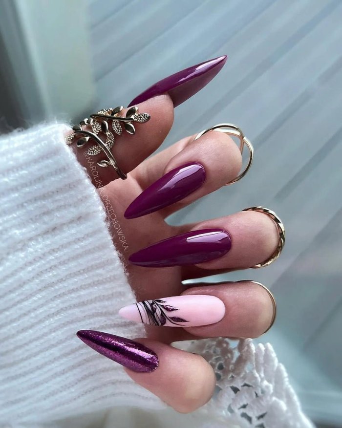 Красный, безусловно, остается вечной классикой, особенно в праздничном маникюре. Но не стоит ограничиваться только им! Обратите внимание на глубокие винные оттенки, благородный бордо и сочный гранат. Эти цвета прекрасно сочетаются с золотыми и серебряными элементами декора.
