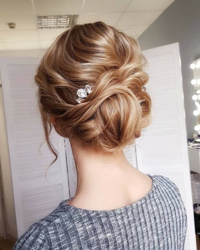- Для платья с закрытым верхом: Выбирайте гладкие прически, пучки.