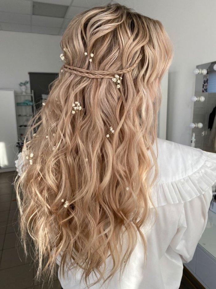 - Косы и плетения: Добавляют образу нежности и романтики. Можно заплести косу вокруг головы, сделать французскую косу или просто добавить несколько плетений в распущенные волосы.