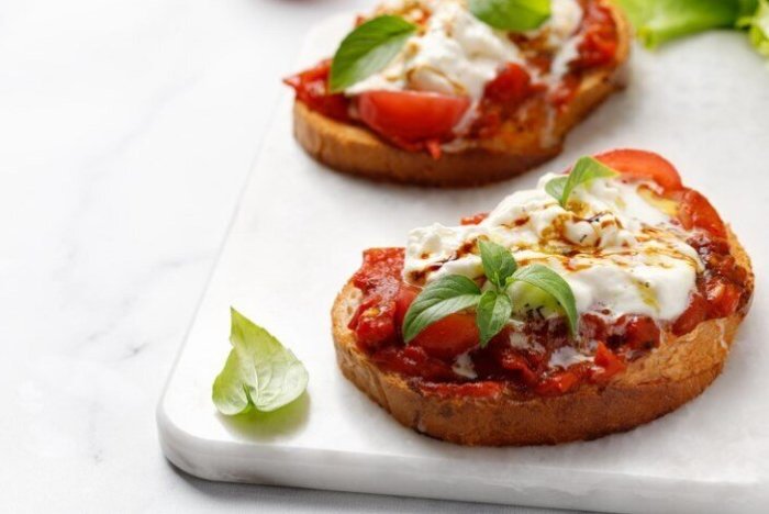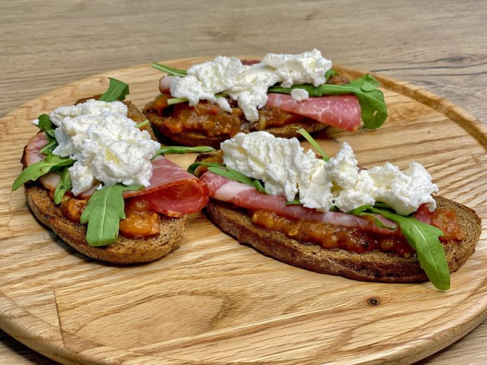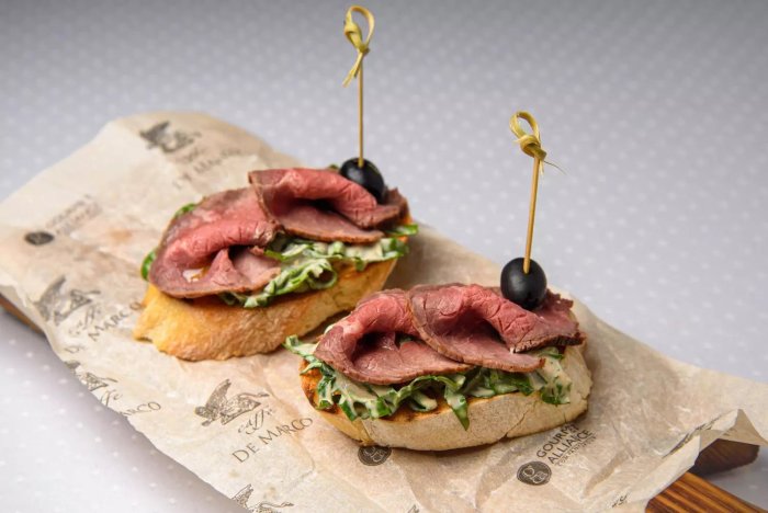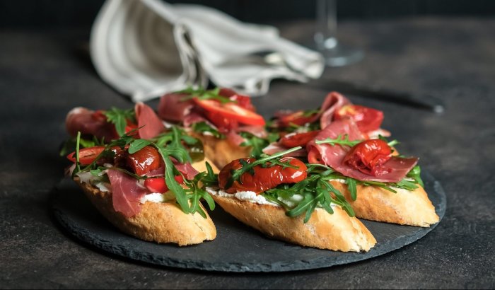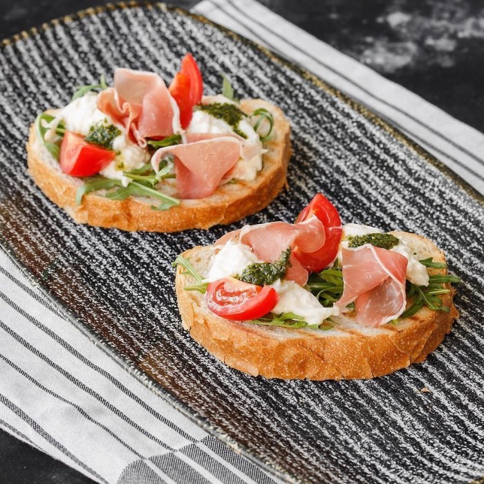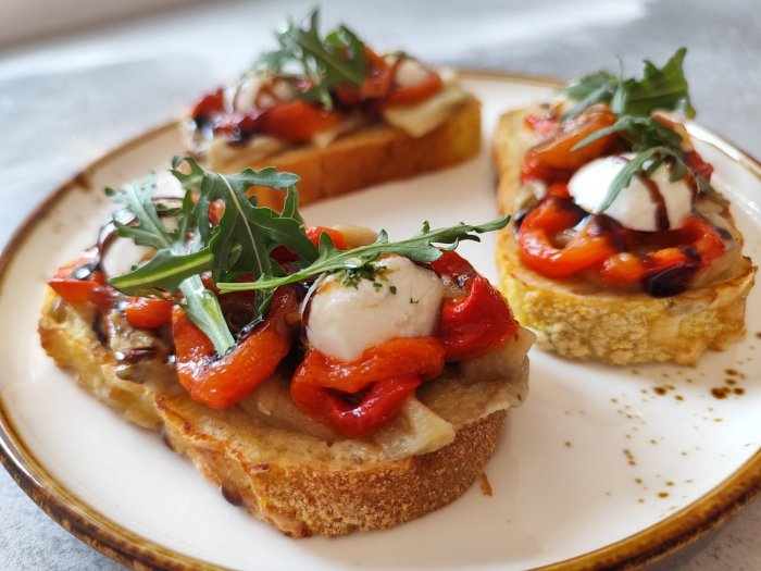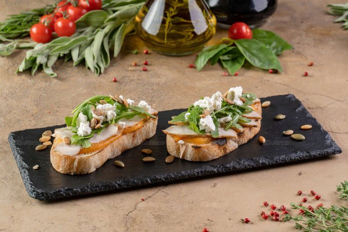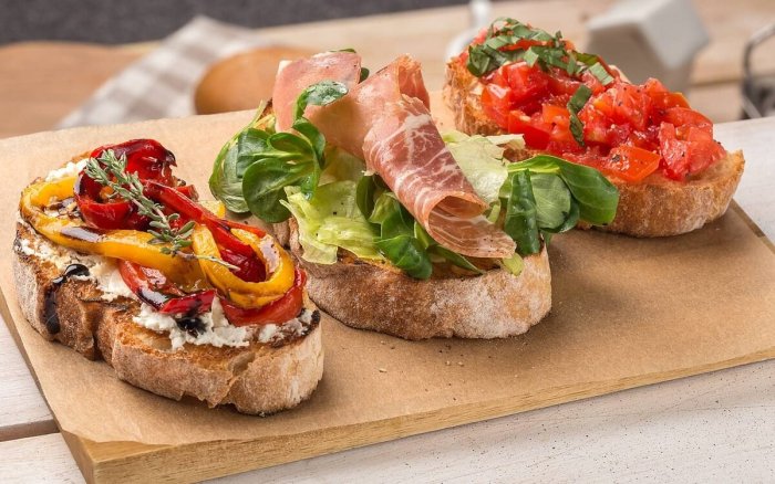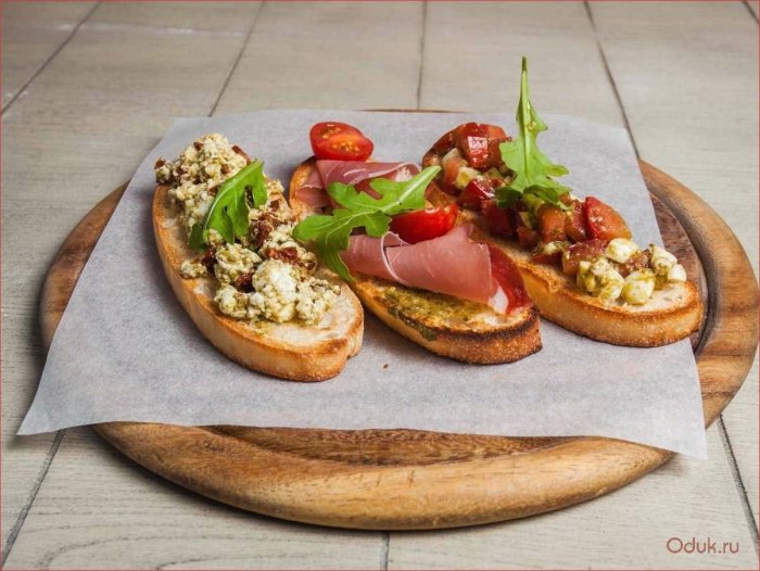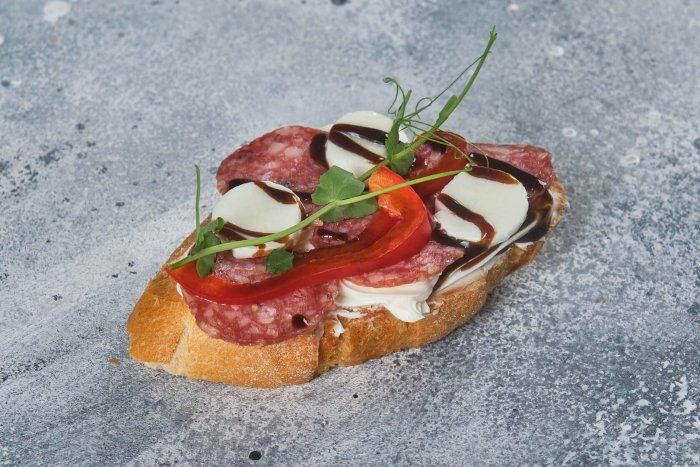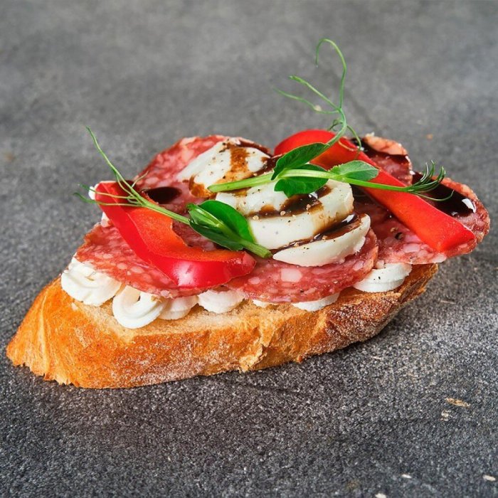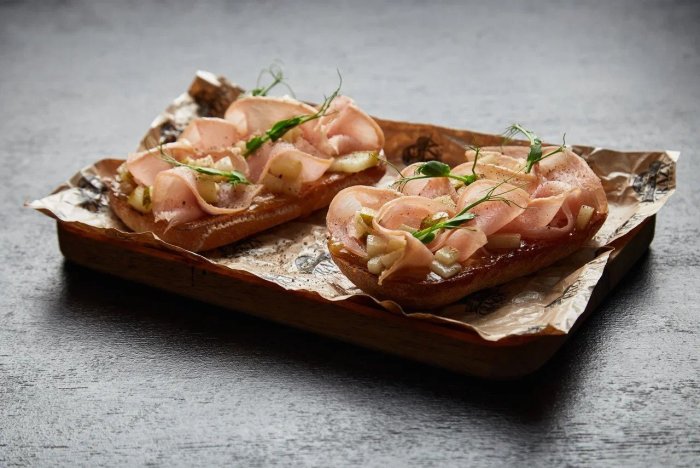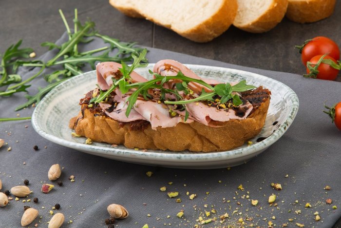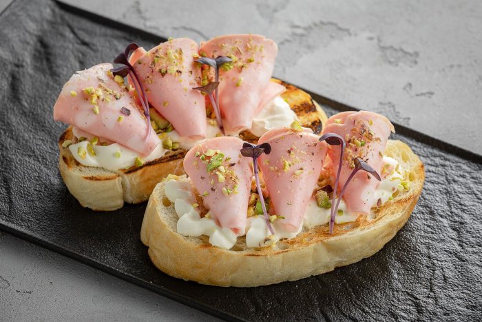Брускетта с мортаделлой - это аппетитное блюдо, которое сочетает в себе простоту и изысканность идеально подходит для легкого перекуса или закуски к столу. Брускетты - это тостовые ломтики хлеба, обжаренные на гриле или в духовке, которые затем натирают чесноком и поливают оливковым маслом. На этих хрустящих кусочках располагается сочная мортаделла, итальянская колбаса из свиного мяса, специальным образом приготовленная и нарезанная на тонкие ломтики. Мортаделла отличается пикантным вкусом и нежной текстурой, что делает брускетту с мортаделлой неотразимой. В завершение, брускетту украшают свежими травами, томатами или оливками, чтобы добавить яркости и аромата этому изысканному блюду. Такая комбинация ингредиентов создает прекрасный контраст между хрустящими тостами, сочной мортаделлой и свежими нотками трав, придающими яркость и свежесть каждому кусочку. Брускетта с мортаделлой - это не только вкусно, но и просто приготовить, поэтому она станет отличным выбором для любого случая: будь то дружеские посиделки, семейный ужин или праздничное застолье. Она порадует гурманов и обязательно станет одним из ваших любимых блюд!